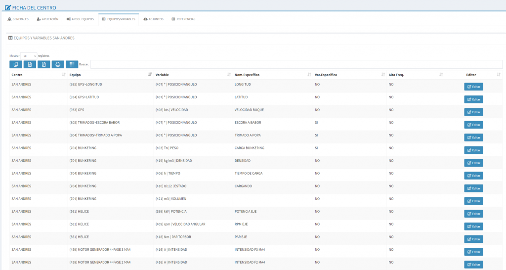 Se ha añadido una nueva pestaña llamada Equipos/Variables en la cual hay una tabla que muestra la información del centro en cuanto a equipos y variables relacionadas se refiere. Los equipos son nombrados teniendo en cuenta todos sus equipos padres. Los campos de la tabla son los siguientes: