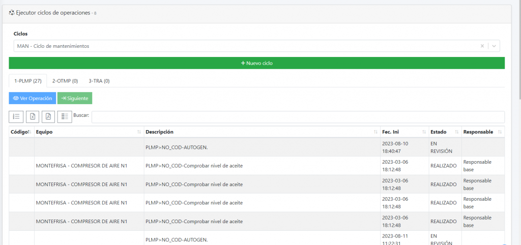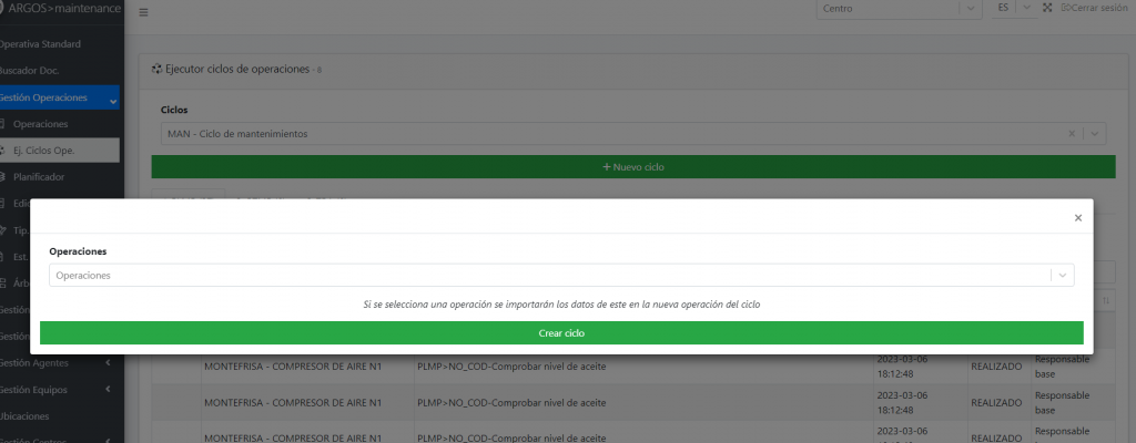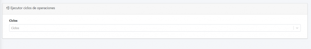 Dentro del menú Gestión Operaciones->Ej. Ciclos Ope. tenemos una nueva pantalla desde la cual podremos crear/editar Ciclos de Operaciones, previamente configurados en su correspondiente página(Gestión Aplicación->Ciclos de Operaciones).