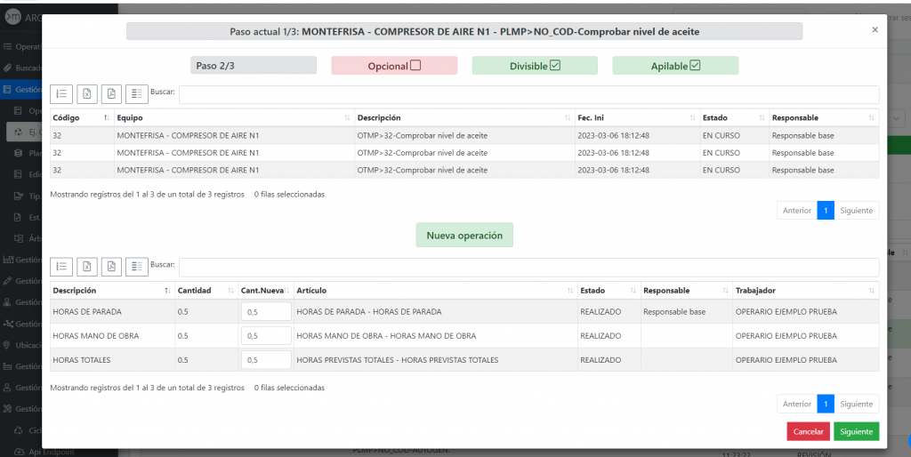 - NO Divisible, SI Apilable: Funciona igual que el paso anterior con la diferencia de que si ya existe una operación en el paso siguiente nos permitirá crear tantos pasos como necesitemos sin validar que ya existe el siguiente.
