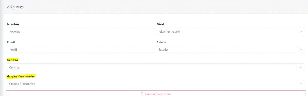 - Se cambia el tipo de control y la ubicación en pantalla de los controles para relacionar Usuarios con Centros y Grupos Funcionales.