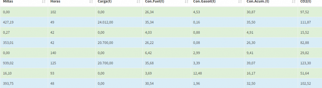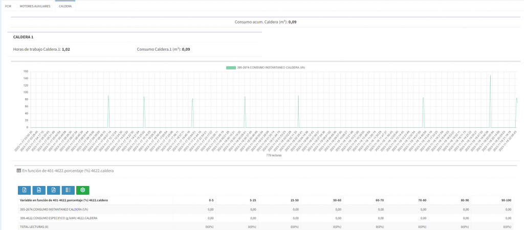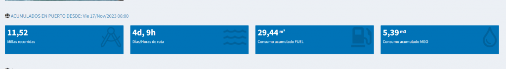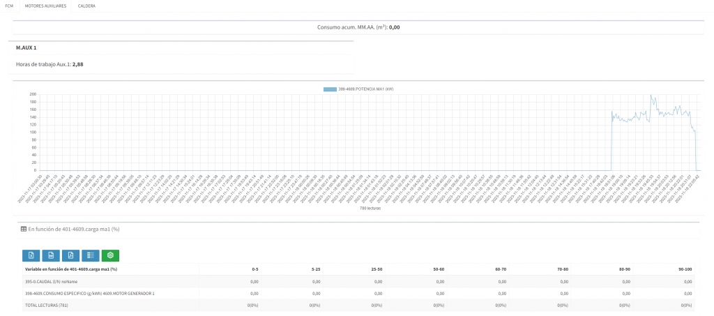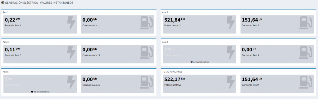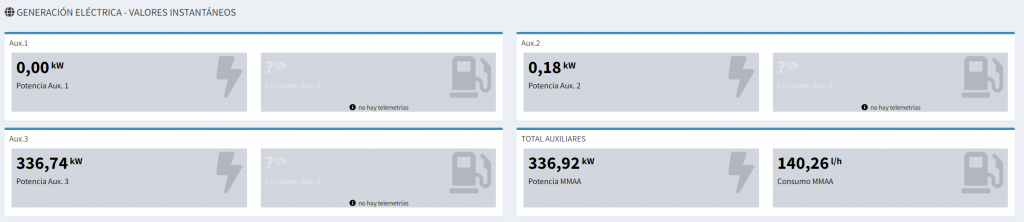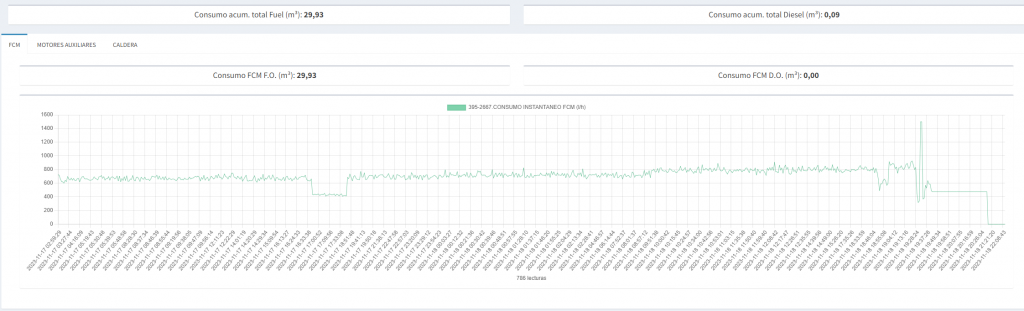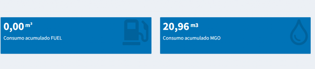 El bloque superior en este caso muestra el total fuel por un lado y por otro el diesel. Estos datos se recogen del equipo fcm del motor principal mas los acumulados de los auxiliares, etc…