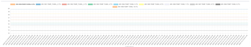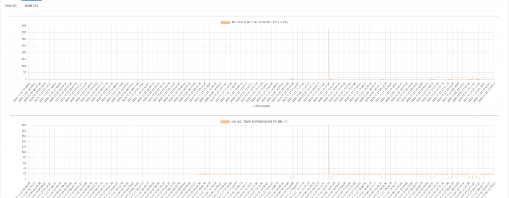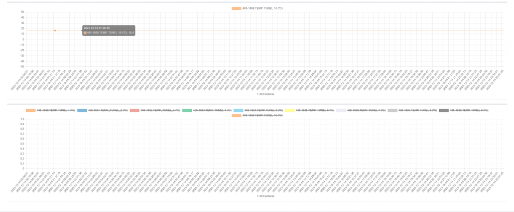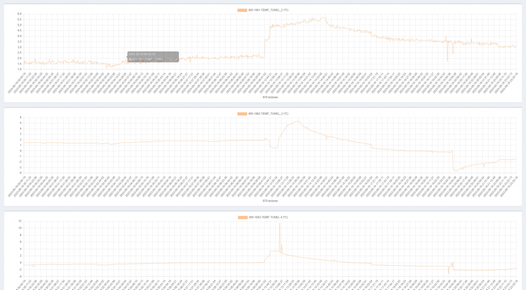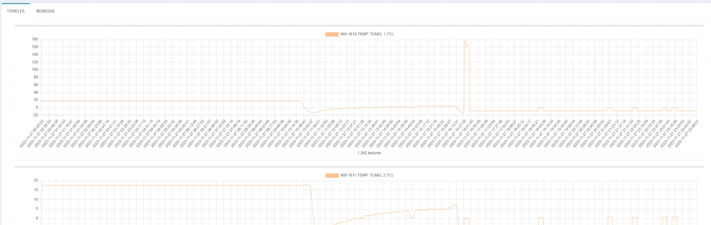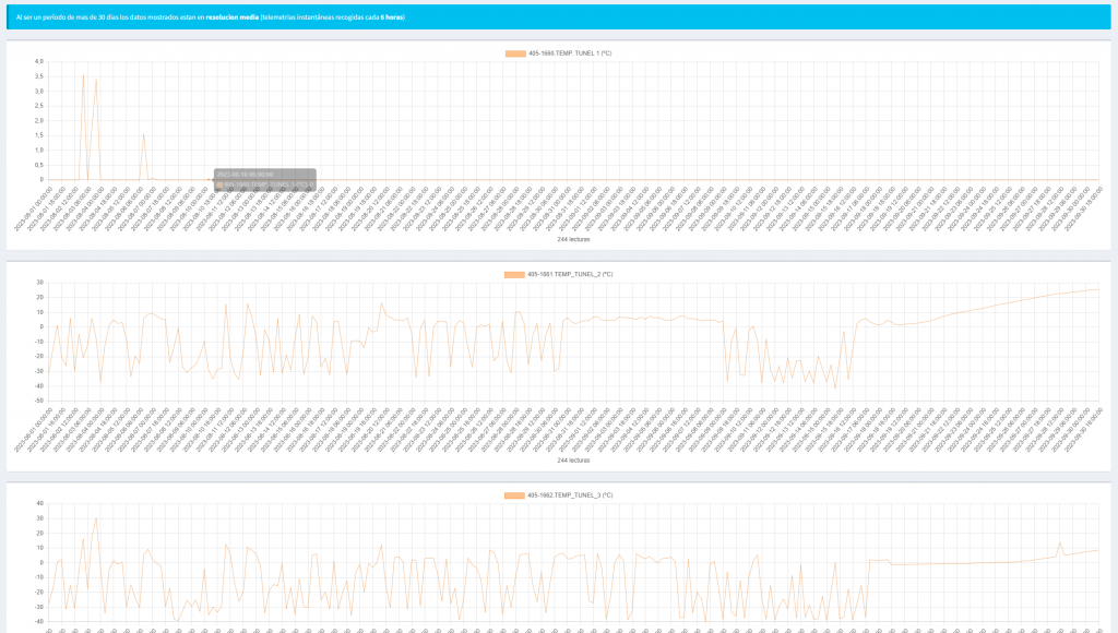 Se ha añadido un nuevo informe al menú(Frio) que detalla las temperaturas de los múltiples tunes de frio que tenga la instalación. Este informe tiene dos formas de mostrar datos. La primera es para periodos menores a 30 días, lo cual funciona como cualquier otro informe, obtengo los datos en máxima y los muestro en las gráficas. Si la cantidad de datos excede el límite que puede mostrar el gráfico para por una función que recude su tamaño conservando la estructura. Aquí un ejemplo de este caso: