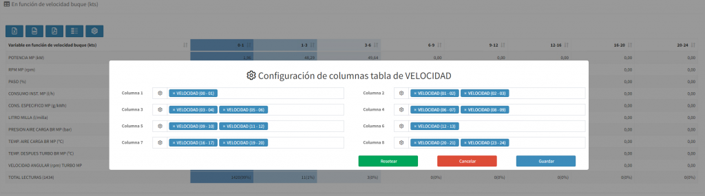 El usuario podrá editar los rangos de cada columna para cada barco que tenga. El programa cuenta con un modelo por defecto que establecerán los usuarios de nivel COTERENA.