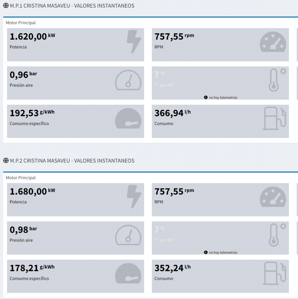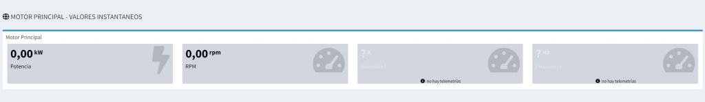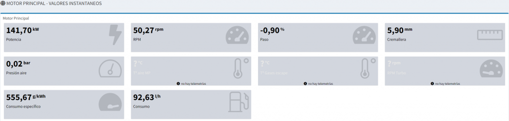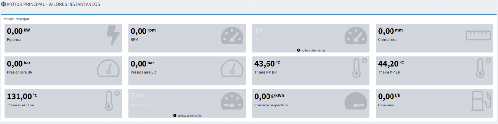 Bloque C: Este bloque es el encargado de mostrar las telemetrías instantáneas asociadas al motor principal del barco o al sistema principal de una instalación. Dependiendo del tipo de centro o lo que queramos tenemos los siguientes tipos: