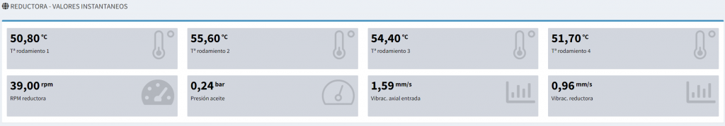 C5: Utilizado por una instalación muy específica para monitorizar sus máquinas, en este caso una reductora. Las variables mostradas son las siguientes: Tª rodamiento 1(ºC), Tª rodamiento 2(ºC), Tª rodamiento 3(ºC), Tª rodamiento 4(ºC), RPM reductora, Presión aceite(bar), Vibrac. axial entrada(mm/s), Vibrac. reductora(mm/s)