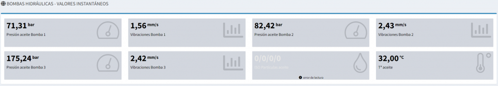 D2: Utilizado por una instalación muy específica para monitorizar sus máquinas, en este caso bombas hidráulicas. Las variables mostradas son las siguientes: Presión aceite Bomba 1(bar), Vibraciones Bomba 1(mm/s), Presión aceite Bomba 2(bar), Vibraciones Bomba 2(mm/s), Presión aceite Bomba 3(bar), Vibraciones Bomba 3(mm/s), ISO Partículas aceite, Tª aceite(ºC)