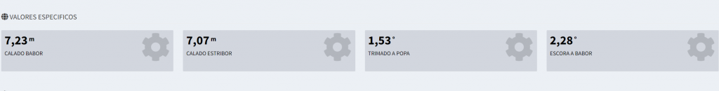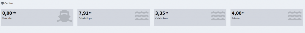 E1: Utilizado para representar el estado de un centro estándar en el mar. Las variables mostradas son las siguientes: Velocidad(kts), Calado popa(m), Calado proa(m), Asiento(m)