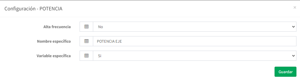 Bloque F: Este bloque se utiliza para añadir telemetrías extra que no se encuentren en ningún otro bloque y así aportar mas información al centro que queramos. Definimos las variables específicas en la pantalla del centro, concretamente en Menú>Gestión>Centros>Equipos>Selección de equipo>Variables>Editar la variable deseada. Aparecerá una ventana donde podemos definir si se trata de una variable específica o no.