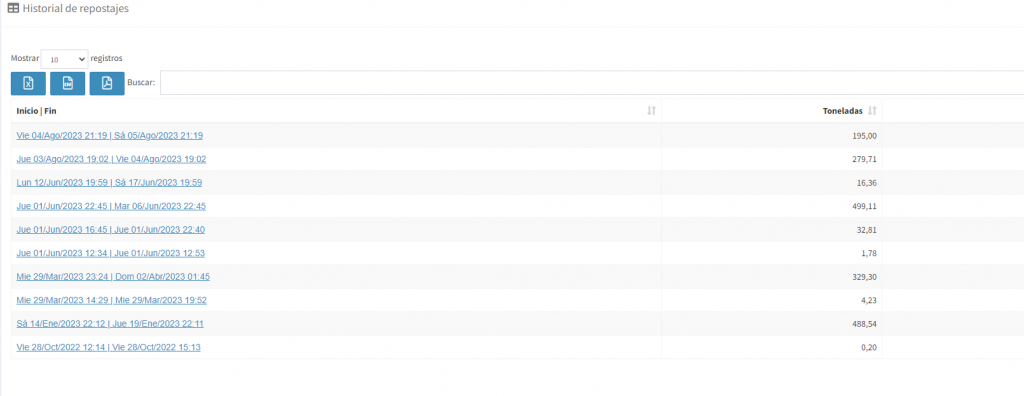 Abajo tenemos la tabla que teníamos anteriormente pero con la diferencia de que al hacer click en el rango de fechas, la pantalla se actualizará sin recarga, modificando las cajas y la gráfica en función al evento que hemos clickado mediante su rango de fechas. Una vez cargan los datos la pantalla vuelve arriba de forma automática.
